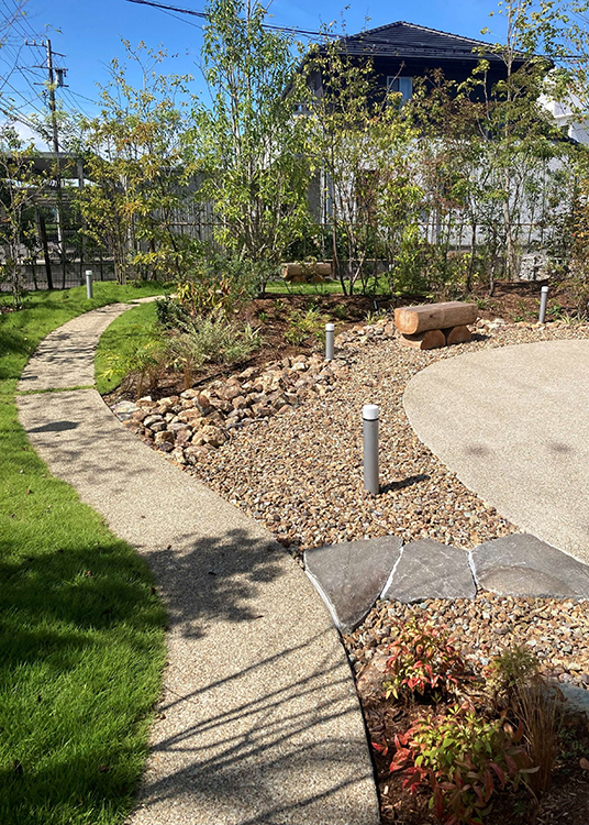 高さの異なる鉄平石の石積は、囲まれた安心感を生み出すデザイン性に加え、ベンチやテーブルとしても活用できる機能性を備えています。サークル状の憩いのスペースを、自然素材でやわらかく囲うことで、訪れる人が心地よく過ごせる場となるよう意図しました。