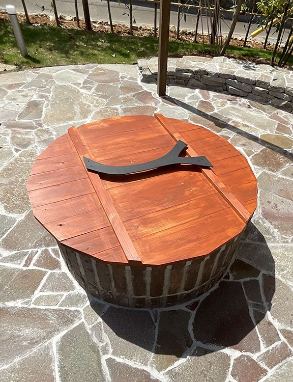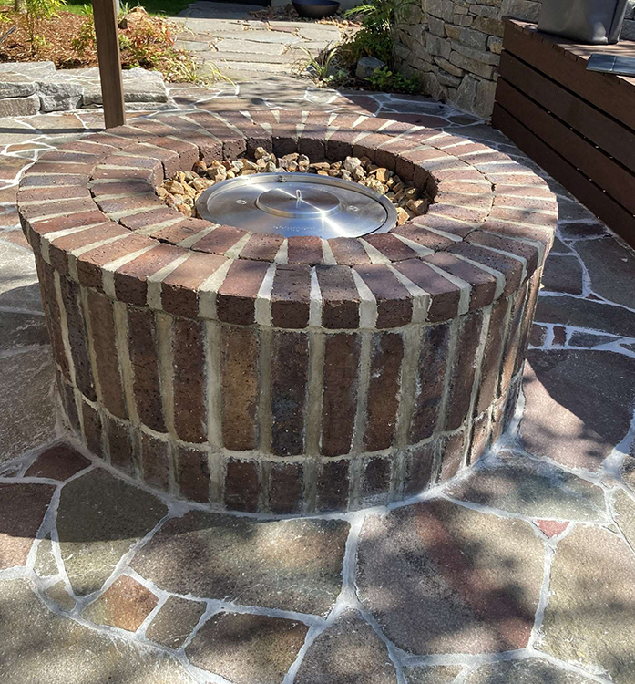 ファイヤーピットは鉄平石となじむ色のレンガで外側を施工し、中にバイオエタノール暖炉を埋め込んでいます。蓋は木製蓋を特注で製作しました。