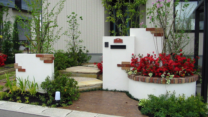 真っ白なジヨリパットの塀に、明るいレンガを貼ってポイントにしています。そして直線的な門柱の前には、曲線の花壇をもってきて変化をもたせています。