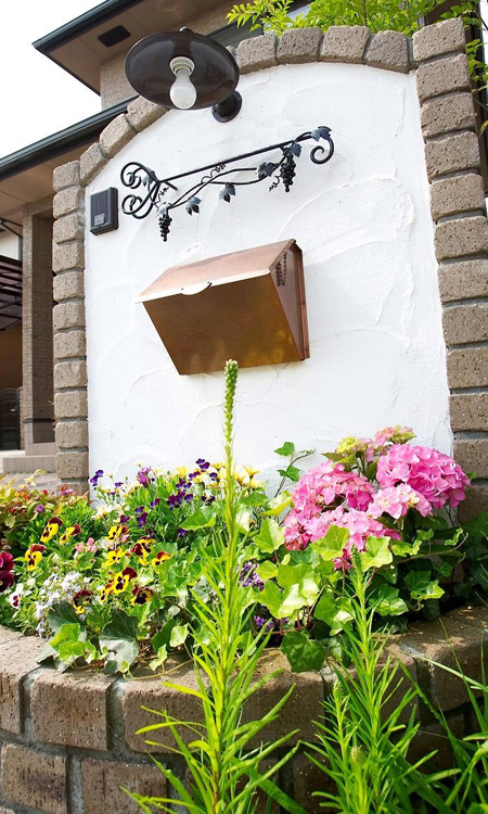 南欧風デザイン門壁に円形で温かみのあるレンガの花壇が組み合わさったもので、花壇には大好きなお花が一年中咲き乱れ見る人をやすらかな気持ちにさせます。