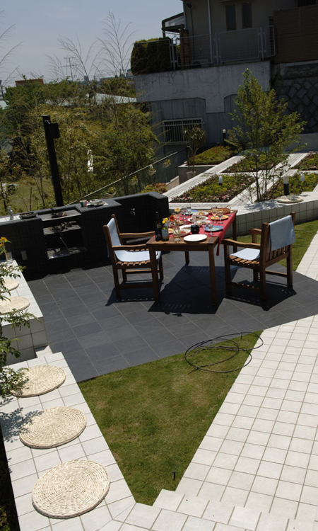 バーベキューテラスや園芸スペース等を立体的かつ幾何学的に配置したお庭で、立上ったタイルの上にもマットを引き大勢で集まってワイワイ過すのも楽しいです。