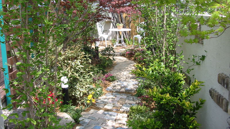 奥のガーデンテラスにたどり着くまでには、四季花咲く宿根草や色とりどりの植物が季節の移り変わりを感じさせてくれるそんなアプローチです。