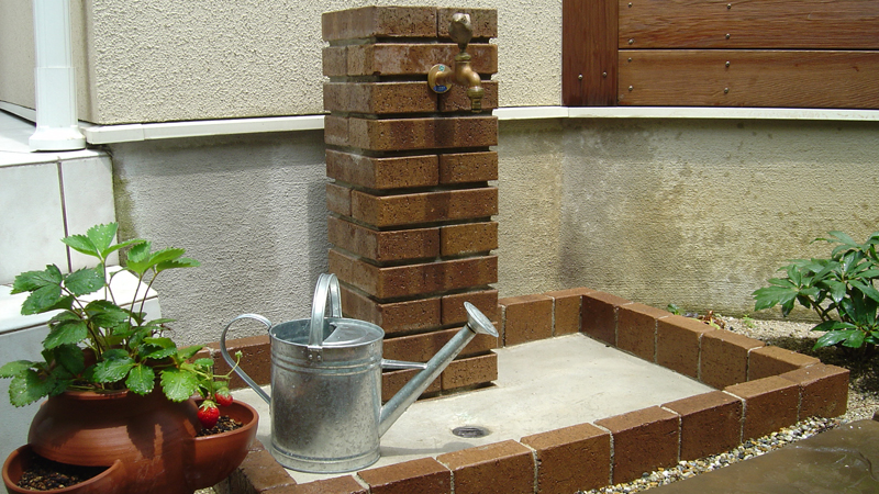 煉瓦をもちいたシンプルなデザインの立水栓ながらも、その使い勝手とお庭やガーデンアイテムの雰囲気に合ったデザインになっております。