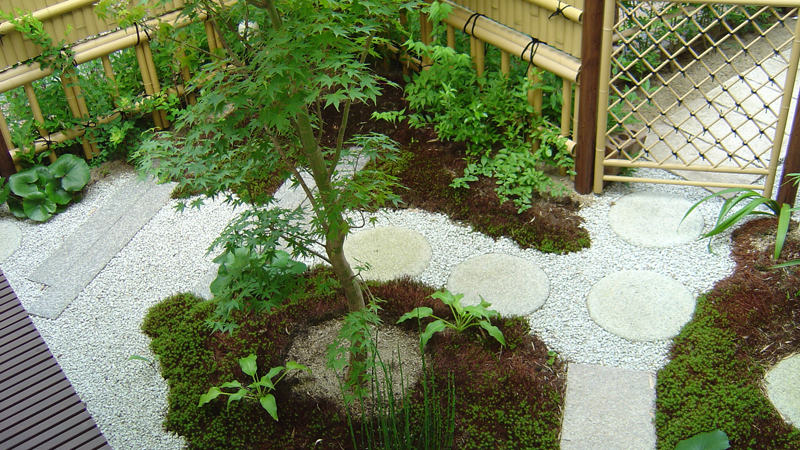 圧迫感を感じさせない竹垣の下方には四つ目垣、上方には建仁寺垣と工夫がなされており、また低いコケ山と白砂のコントラストが美しい上品な和風庭園。