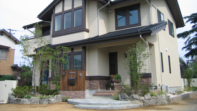 山合いにあるペンションを想わせる外観と調和するようにエクステリアは自然素材で統一し、ポイントに植えたエンゼルヘアーが風が吹くたびにそよぎ、安らぎを与えてくれます。