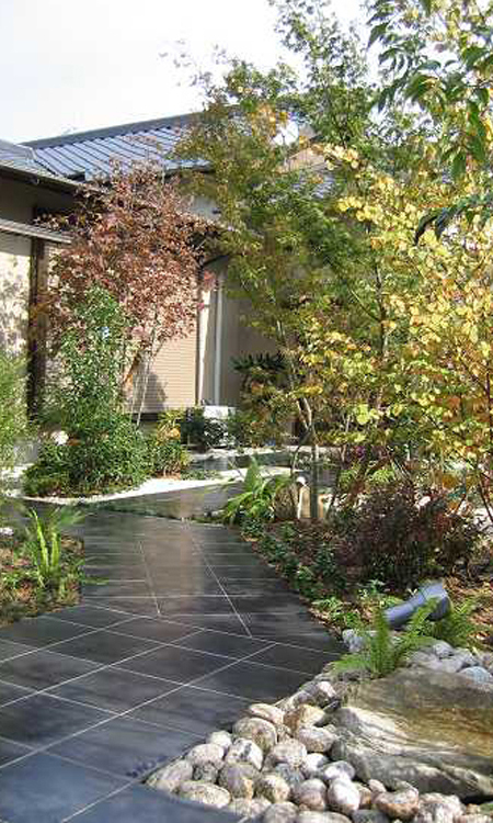 ダークカラーでまとめられたエクステリアに、木々は四季折々で変化する葉色が映え、一年を通して様々な景色の移り変わりを楽しめるお庭です。
