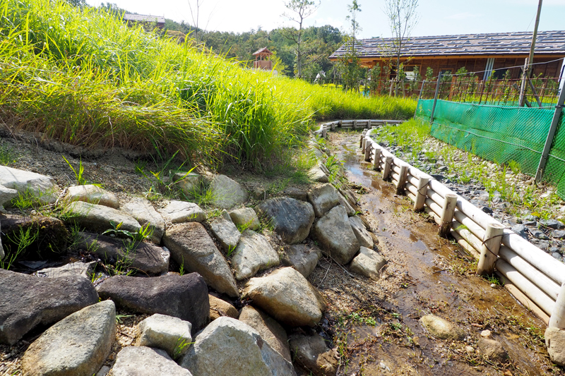 タタラ場に続く木橋の下には、枯流を創出。