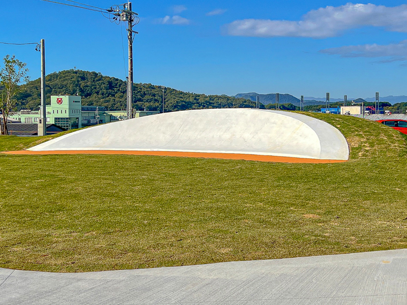 全面アスファルト舗装されたBMXパークです。芝生広場の築山ともつながるような波状コース(パンプトラック)となっています。曲線に合わせた法面に芝張を行いました。