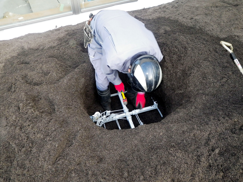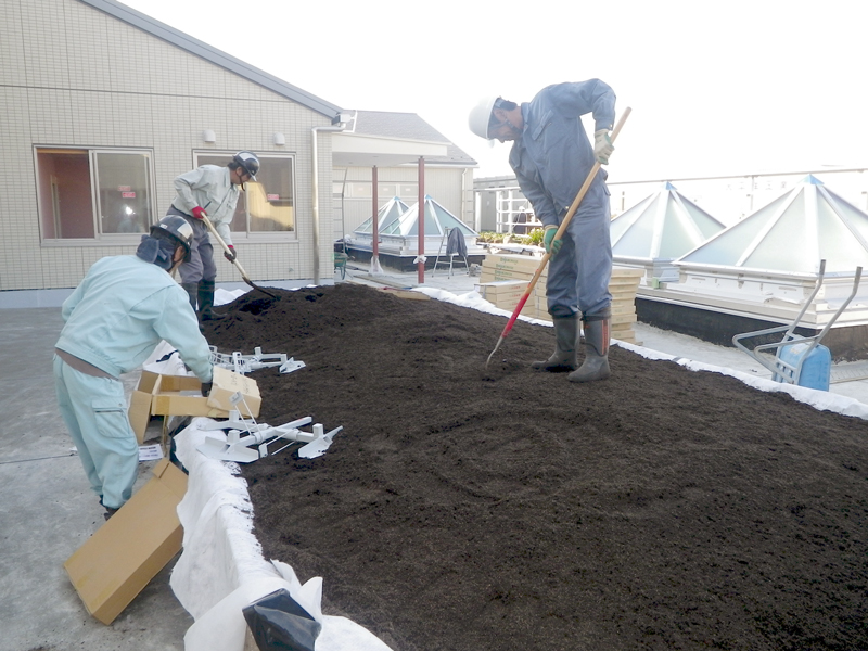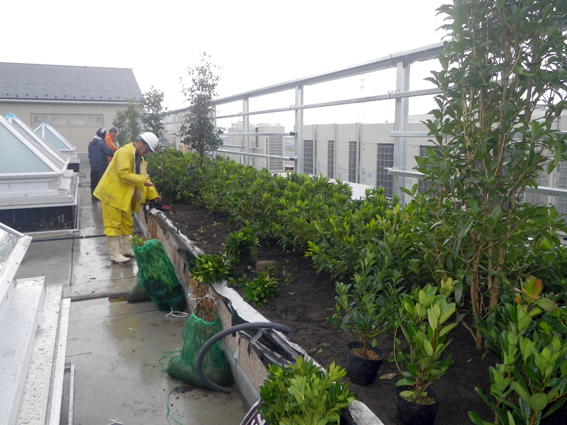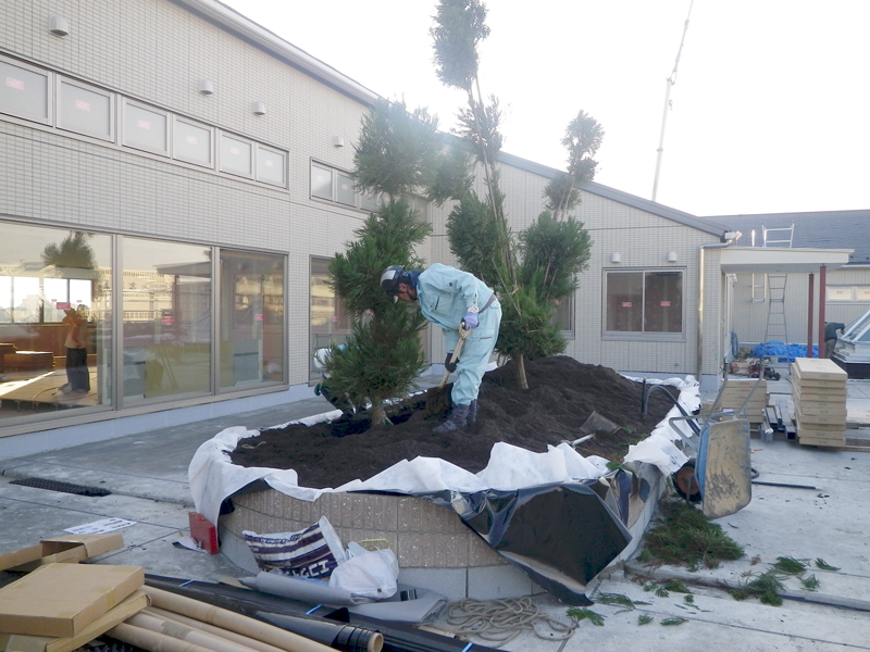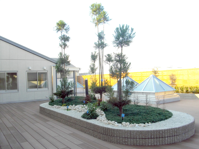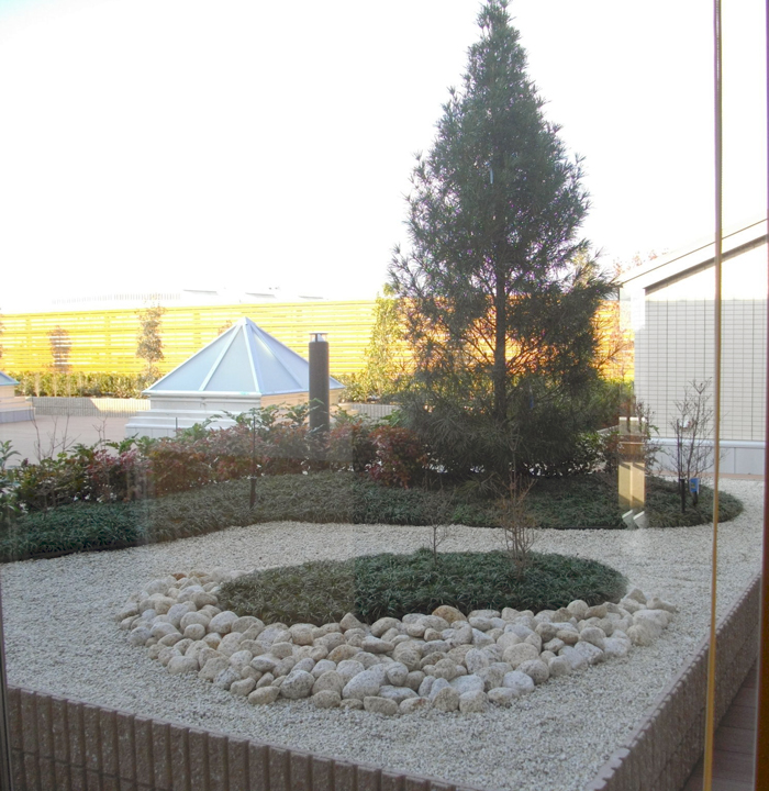 | 3F屋上緑化 高さの異なるダイスギ3本をメインとし、足元をタマリュウと白色の砂利で仕上げました。その中にツワブキ、オタフクナ ンテン、ドウダンツツジ、センリョウを配置し、趣きを演出しました。 |