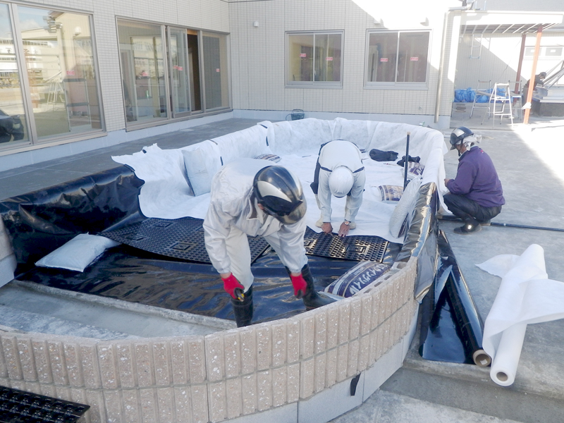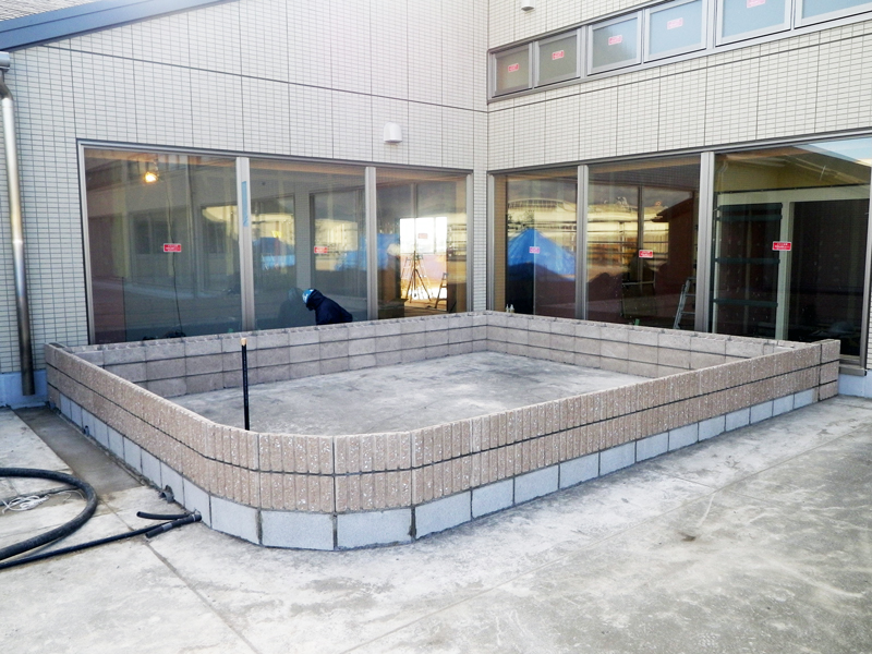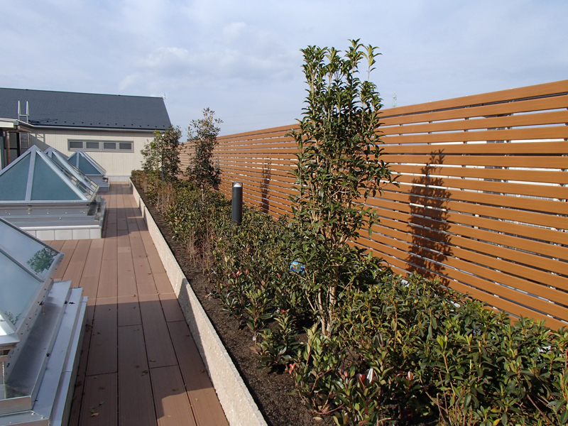 | 【 コメント 】 当初は管理が楽とのことで常緑樹が主体の洋風庭園でしたが、会長室から眺めたいとの御施主様の希望から和風庭園に変更しました。周囲はデッキで施工されており、社員さん達の憩いの場所になることでしょう。植栽してからちょうどツワブキの花が開花し、とても喜んでいただけました。 |