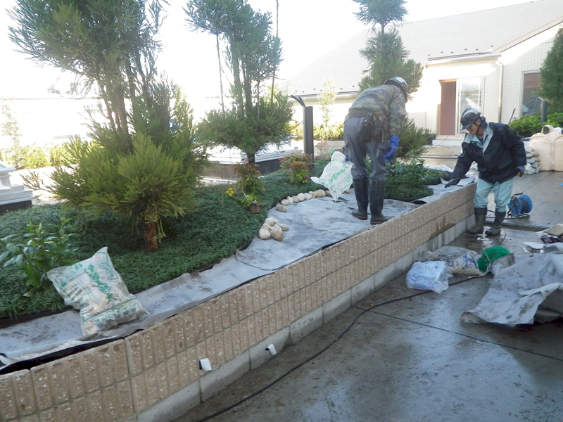 ![]() こちらの花壇はコウヤマキを据えて、上記花壇と同様に砂利とタマリュウで 統一感を出しました。 |
