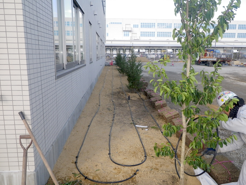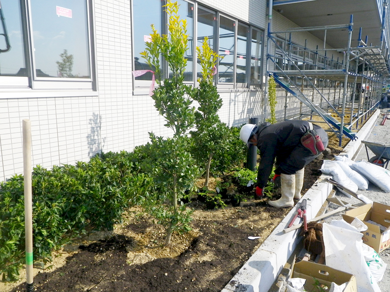 | 南入口には、シンボルツリーとして9mのクスノキの大木を植栽し、存在感が満点です。 建物周囲や外周にはマテバシイ、ヒメユズリハ、ツツジ等が多く植栽され、植栽帯には全て自動散水が配置されています。 |