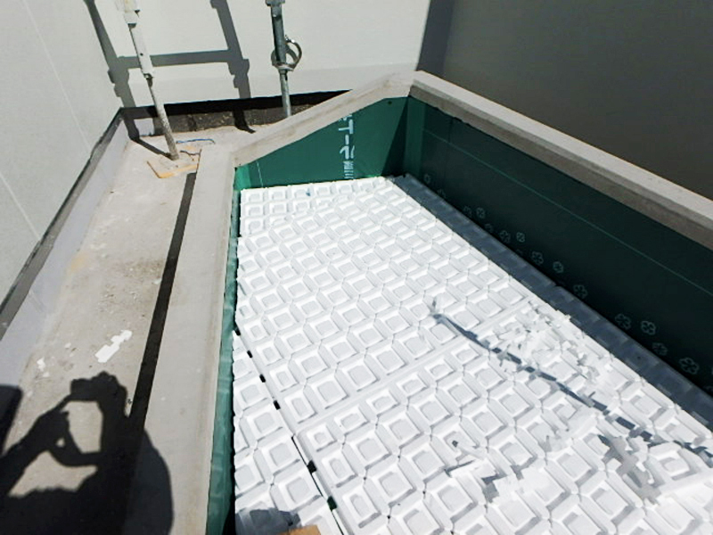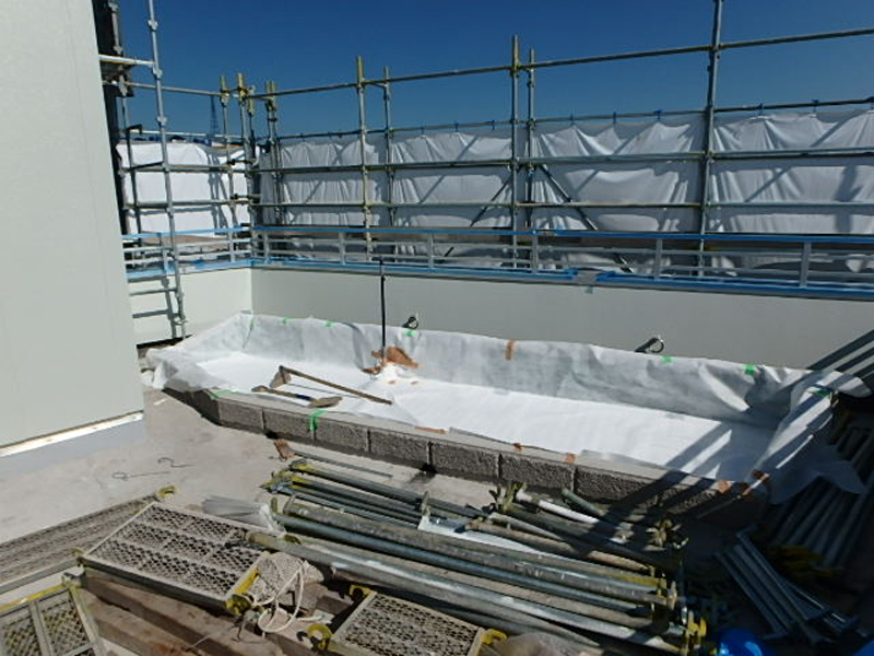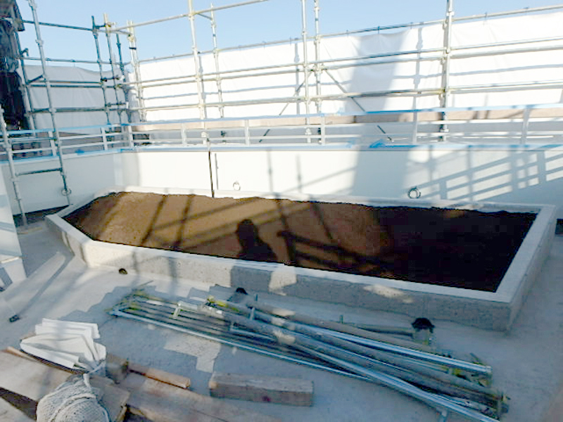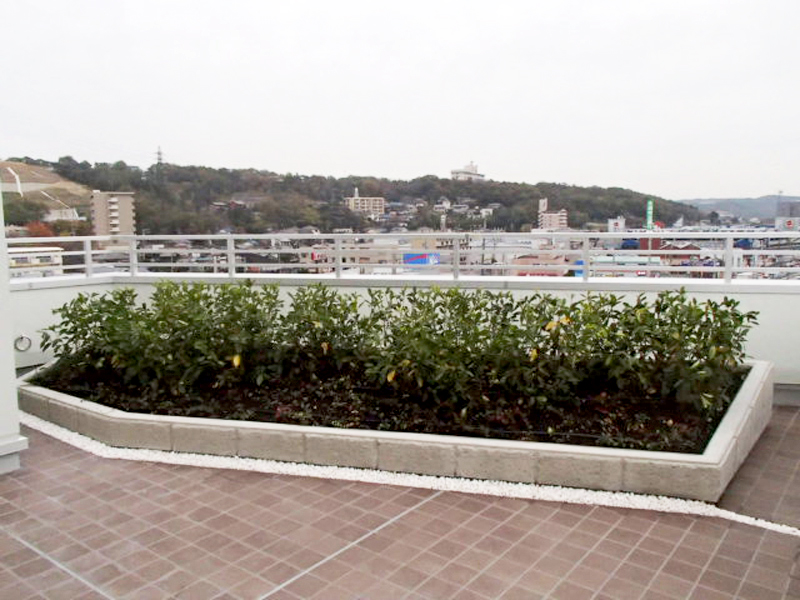 石田大成社様の新オフィスが多治見市に建設されました。4階屋上ピロティ―の花壇に、屋上緑化と外構の緑化工事を施工させていただきました。屋上緑化は防水と植物の根っこへの対策が肝心です。そこで今回は自着型耐根シートを用いて、年々育つ植物の強靭な根っこにも対応した、屋上緑化システムになっています。花壇の土は、軽量土壌で水はけが良い為、自動散水が必要です。