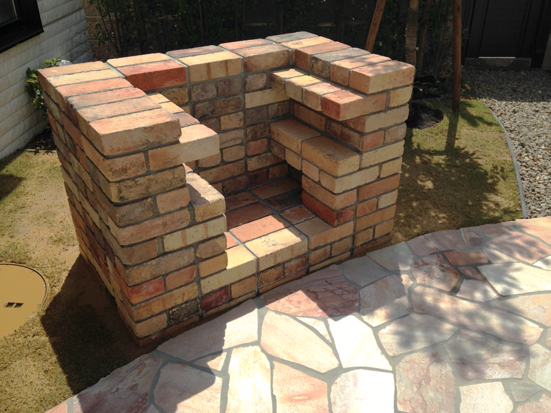広い芝生広場を乱形石張りの園路で囲っています。フォーカルポイントとしてガゼボを配置し、プール棟横にはバーベキュー炉があります