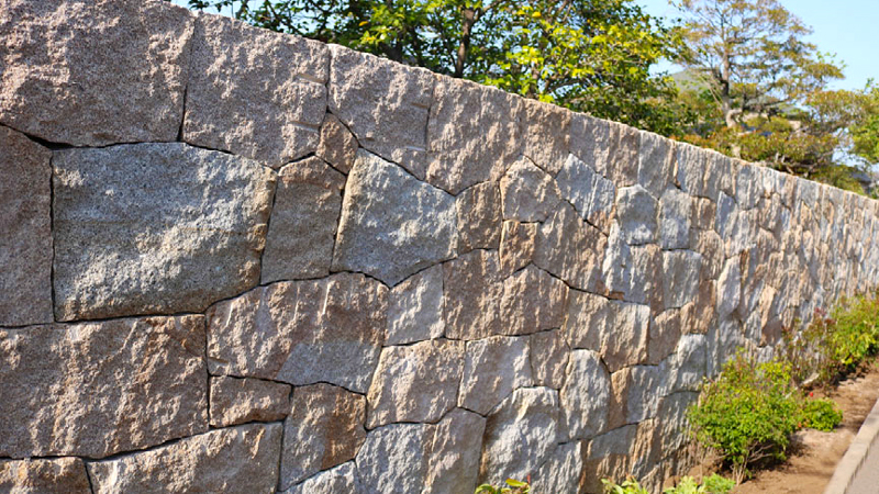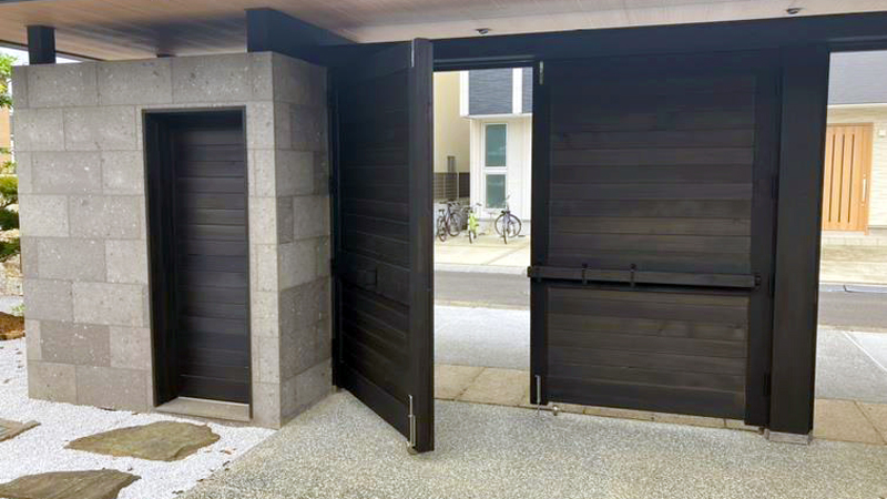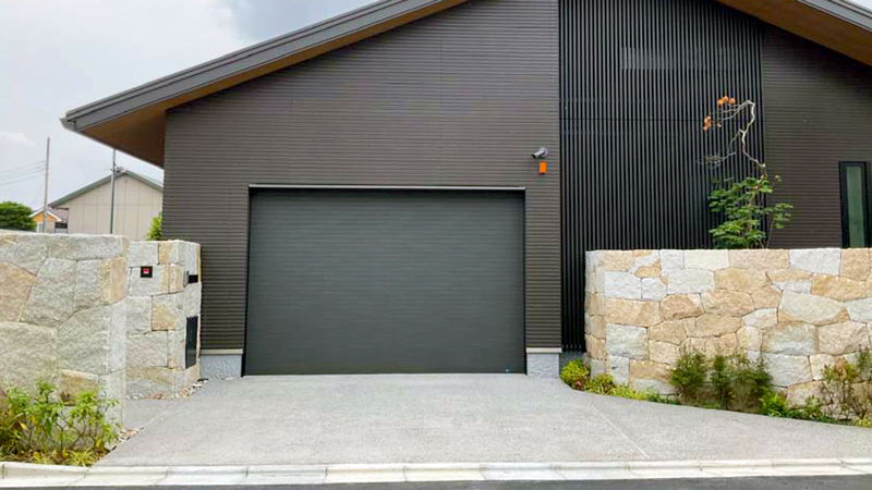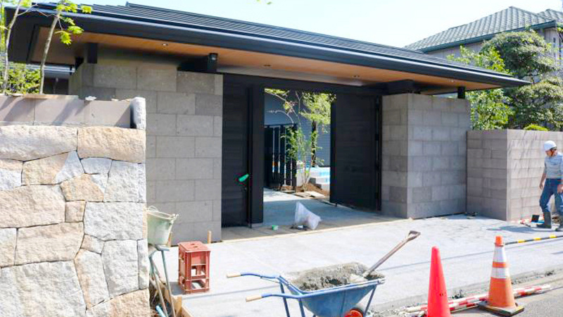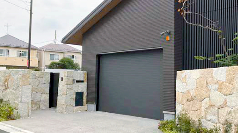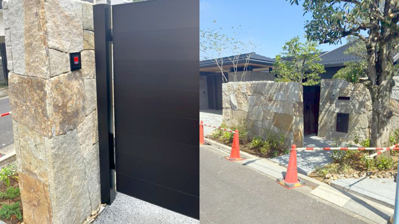旧宅の長屋門をイメージしつつ、両袖に白河石を張ったモダンな長屋門 勝手口には電気錠を採用