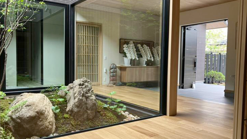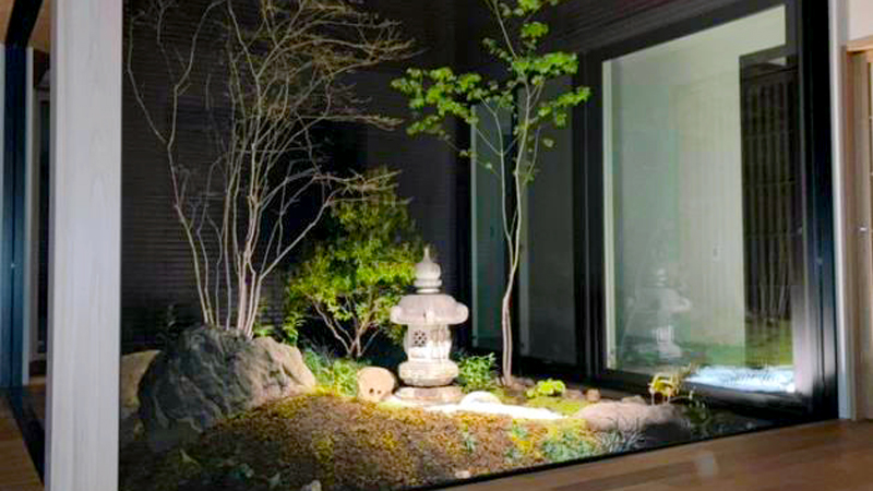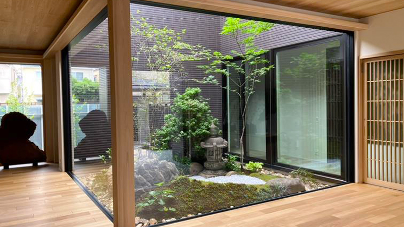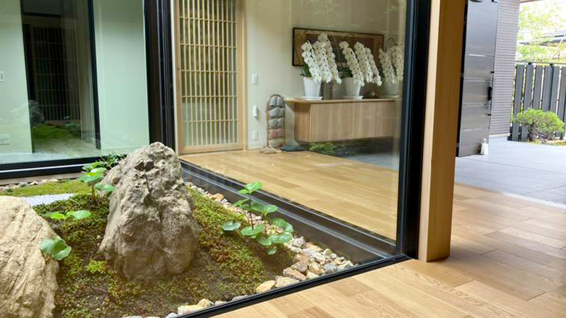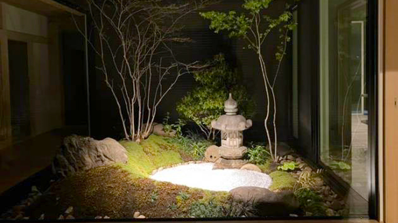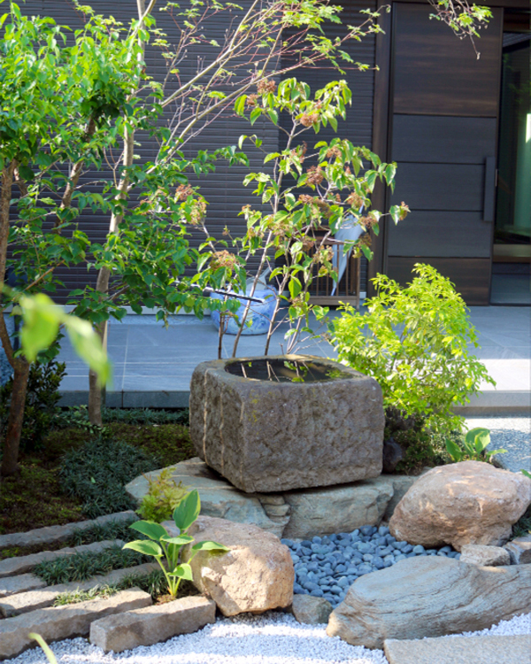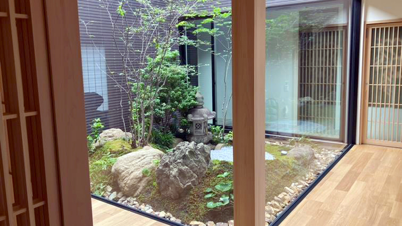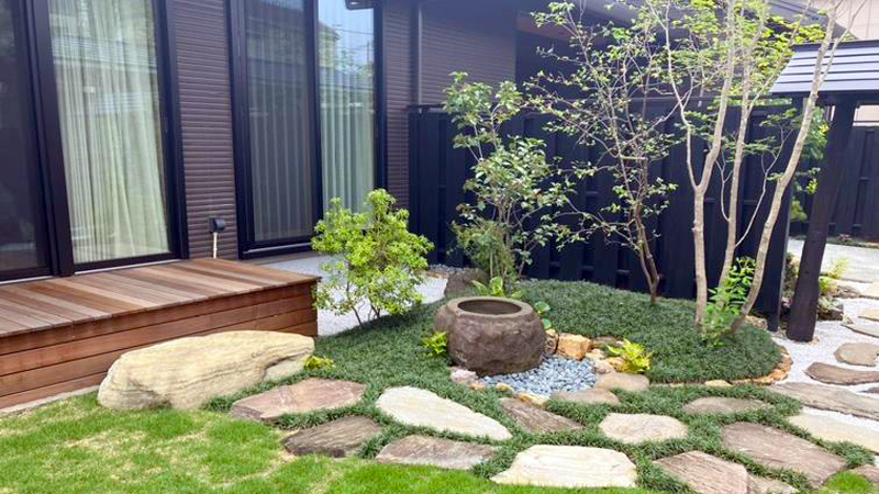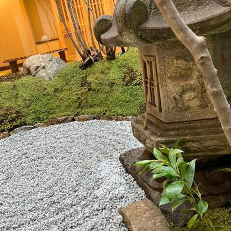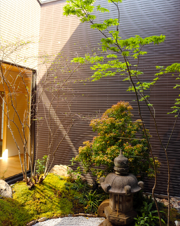 主庭はもとの庭にあった景石や灯籠・樹木も多く活用しリズミカルに配置された新旧樹木がうまく混ざり合い、お庭の新しい風景をつくり出しています