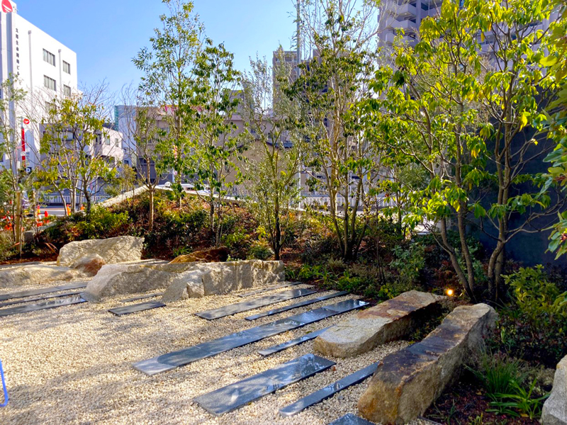 岡崎公園と親和する植栽計画と石の都らしいエントランスの構え、建物の足元には植栽を豊富に設けました