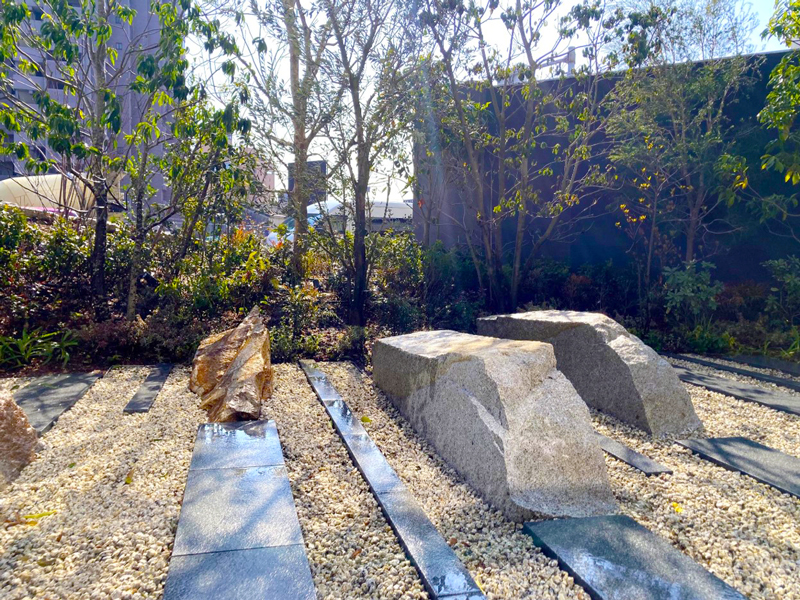 直線に配した板石と景石で岡崎市に流れる乙川を表現しました 景石は恵那石、板石は黒色の御影石をバーナー仕上げしたものを使用しています