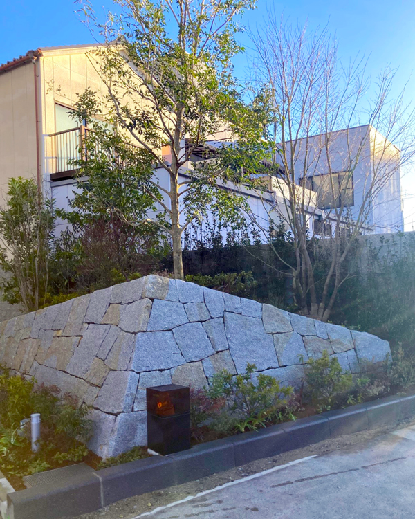交通量が多い国道1号線沿いという立地で、タイル工事、インターロッキング工事他、同時進行で外構工事が進められ、制約の多い中での工事でした。その中でも、造園工事に対する思い入れが強い設計士さんの意図を崩さないよう細心の注意を払いながら協力会社の力を借りて無事完了することができました。