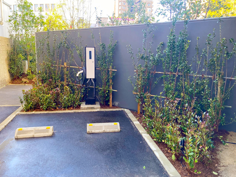 目隠し壁の前後にも植栽帯を設け、緑の連続性を意識した設計となっています ロドレイア、ドウダンツツジ、サルスベリが花を咲かせます